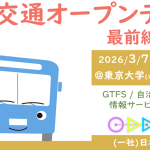 2026年2月3日 / 最終更新日時 : 2026年2月3日 kenji morohoshi 未分類 2026/3/7 公共交通オープンデータ最前線2026 開催のお知らせ 2026年3月7日(土)10:30より、当協会が主催する公共交通オープンデータの整備・活用などに関する取組紹介・交流イベントが開催されます。今年で第9回目の開催となります。皆さまのご参加をお待ちしております。参加申込や詳 […]